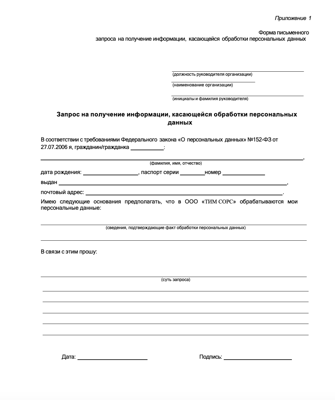5. Актуализация, исправление, удаление и уничтожение персональных данных 5.1. Оператор вправе изменять и уничтожать данные в соответствии с законом. 5.2. По запросу субъекта Оператор обязан: – предоставить сведения о наличии данных; – дать возможность ознакомления с ними; – уточнить или изменить; – блокировать или уничтожить незаконные или ненужные данные. 5.3. Запрос должен быть в письменной форме с указанием паспорта или документа субъекта. 5.4. Запрос может быть направлен в электронной форме и подписан ЭЦП на почту: builova@teamsource.ru 5.5. Запросы регистрируются в журнале учета обращений субъектов. 5.6. Ответ предоставляется в течение 10 рабочих дней (с возможным продлением на 5 дней).